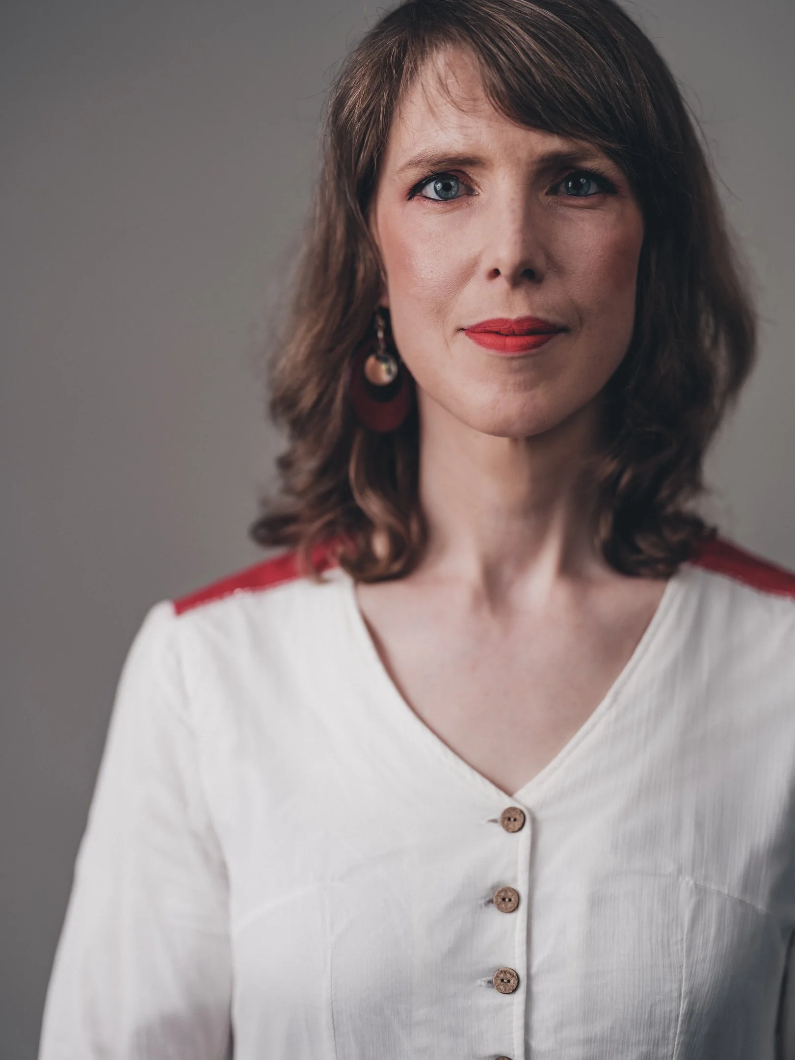 En gravid kvinna i vacker klänning som sitter på en mjuk, vit yta, med en rött tyg som flyger bakom henne.